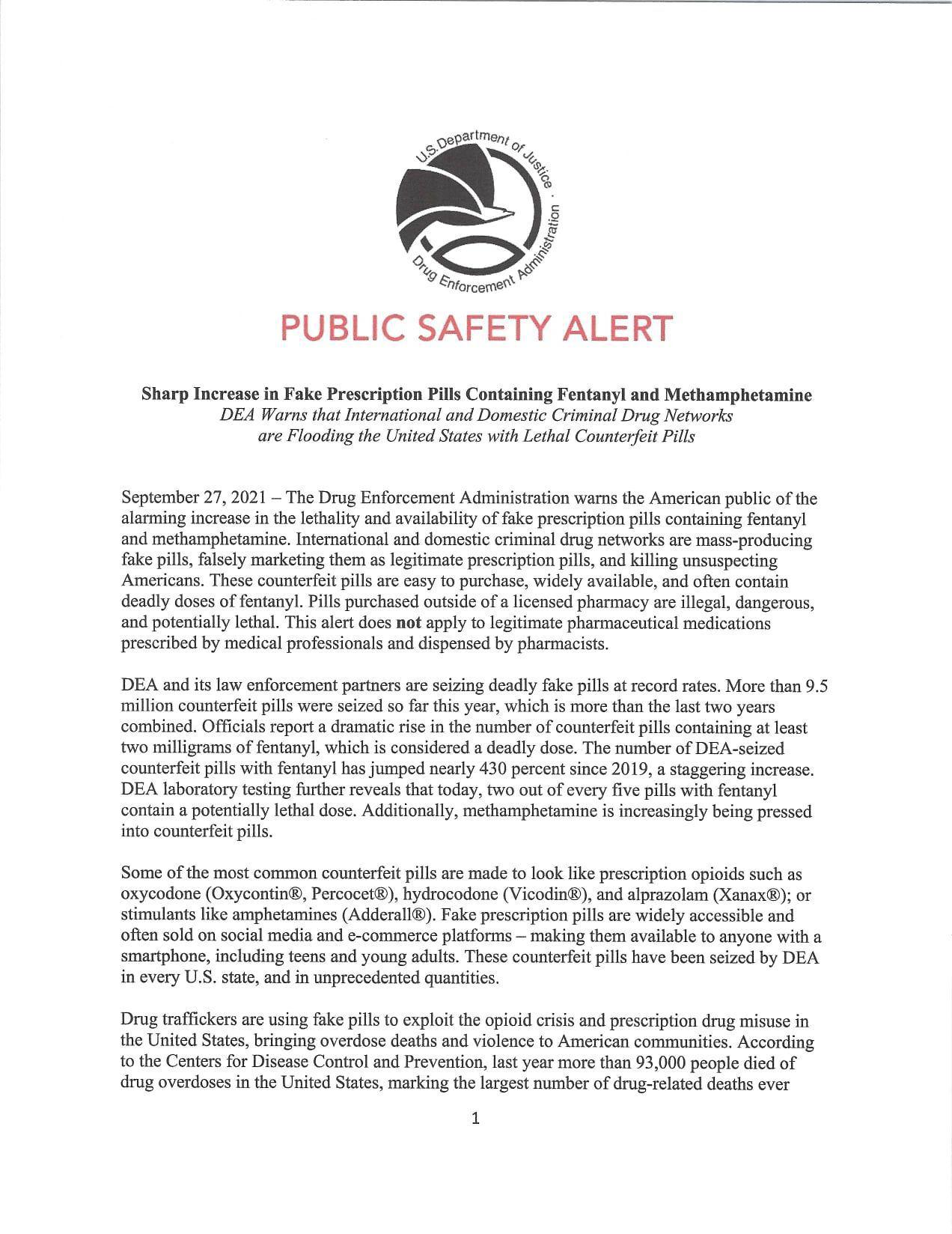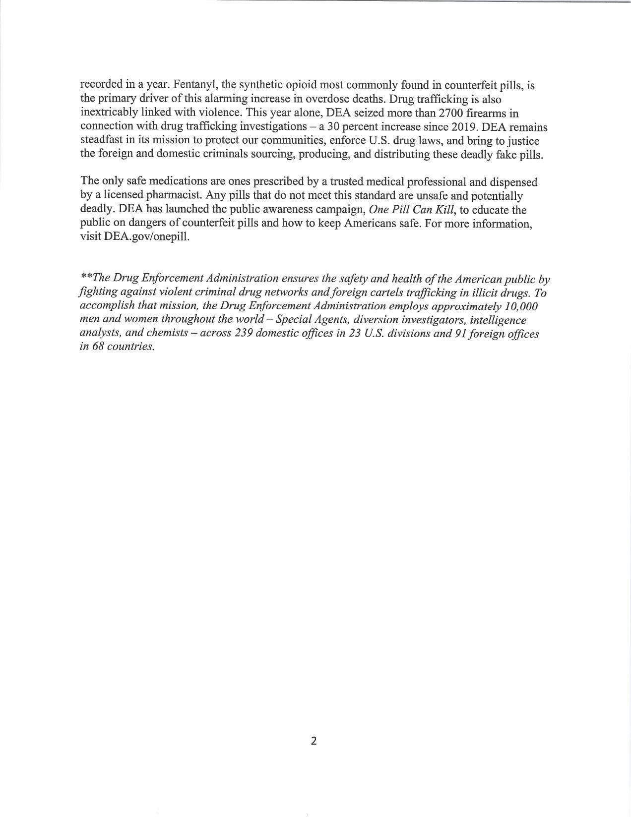 The only safe medications are the ones prescribed by a trusted medical professional and dispensed by a licensed pharmacist. Any pills that do not meet this standard are unsafe and potentially deadly. DEA has launched the public awareness campaign, One Pill Can Kill, to educate the public on dangers of counterfeit pills and how to keep Americans safe. For more information, visit DEA.gov/onepill