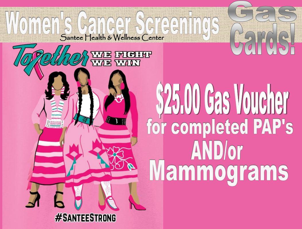 Through financial support from the Great Plains Tribal Leaders Health Board, the Santee Health & Wellness Center is able to offer a $25.00 gas voucher for completing a breast AND/or cervical cancer screening test (mammogram and/or pap smear).
