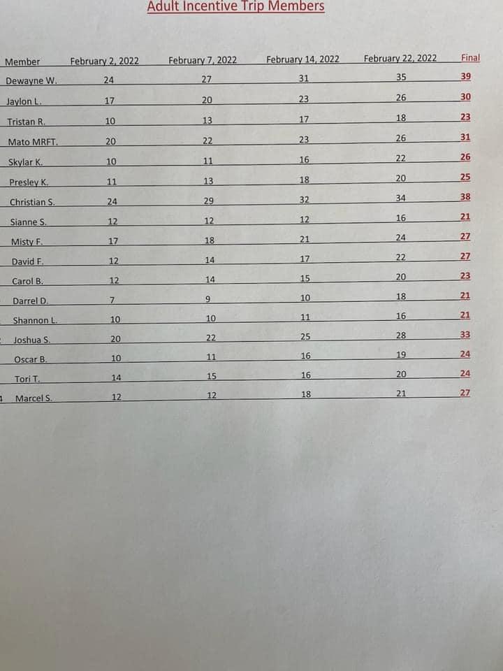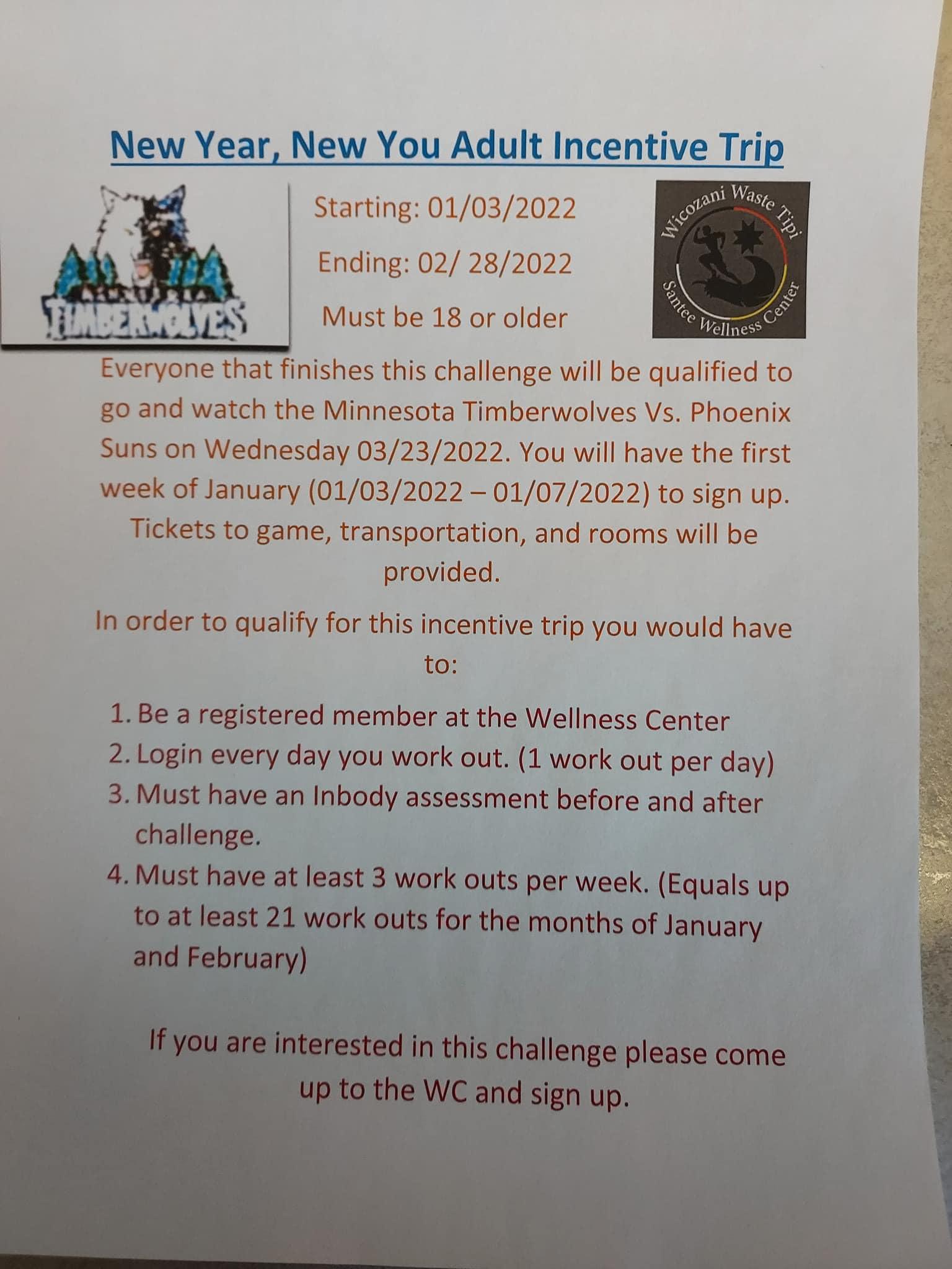If any of the individuals would like to drive themselves they are more then welcome too. The tickets to the game and rooms will be paid for. So please bring money for food and snack or whatever you would like to do. If you decide to ride in the vans or drive yourselves plz let us know so we could plan accordingly. The Wellness Center would like to congratulate and thank all the individuals that participated